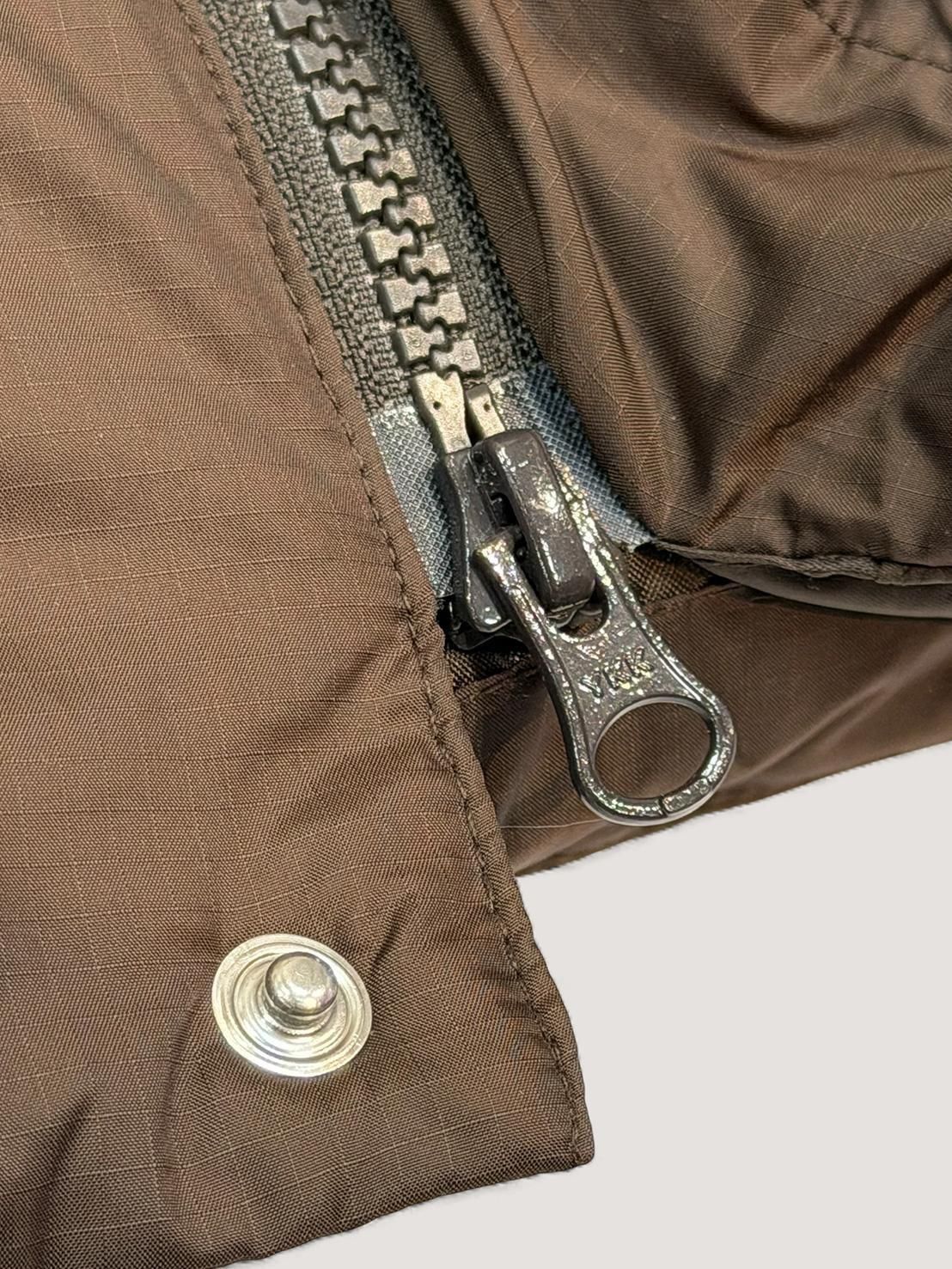 WOODBLOCK刻印入りオリジナルスナップボタン、ダブルジップ仕様、袖口にもスナップボタン付き。