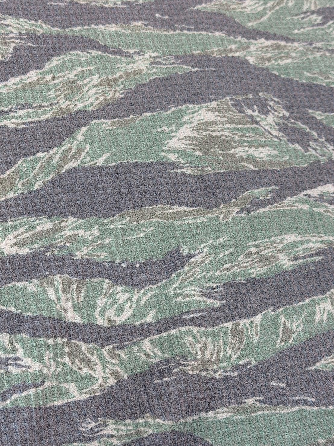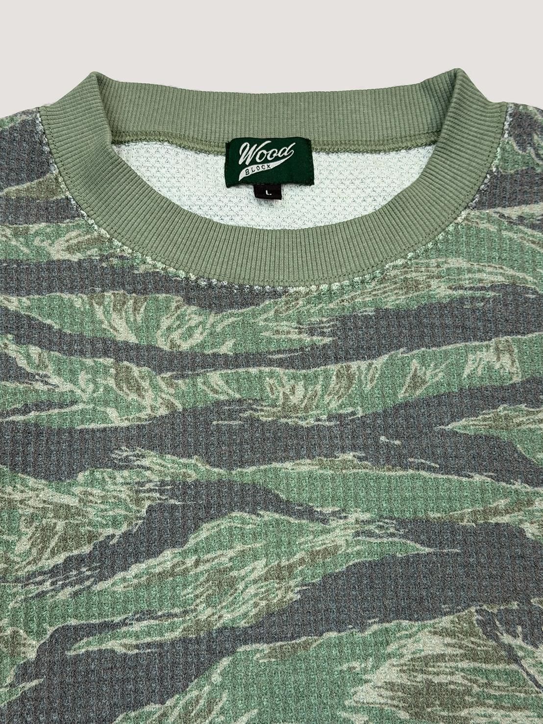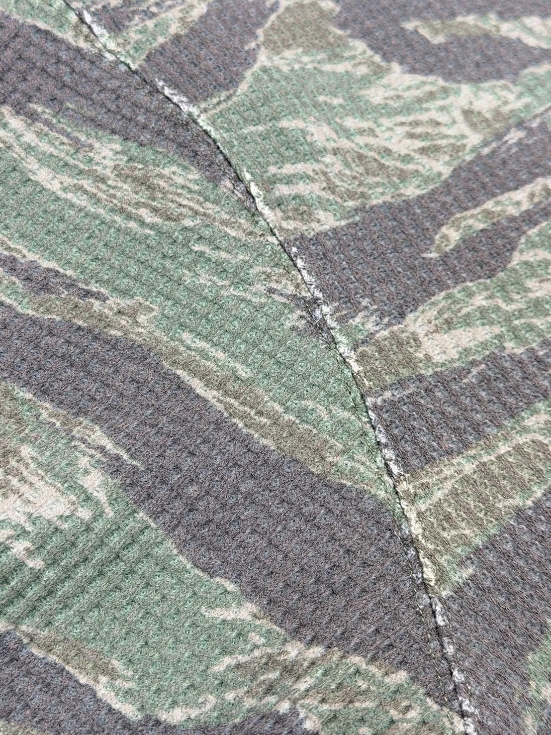 先日リリースのタートルネック同様のサーマル生地にWOODBLOCKオリジナルCAMO柄をプリントし、CREW NECK仕様に仕上げました。