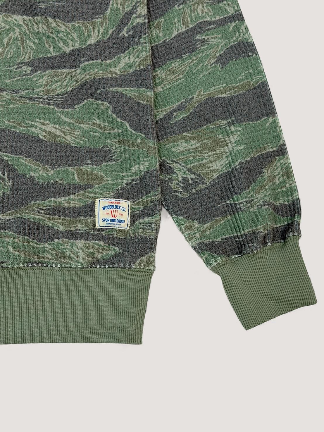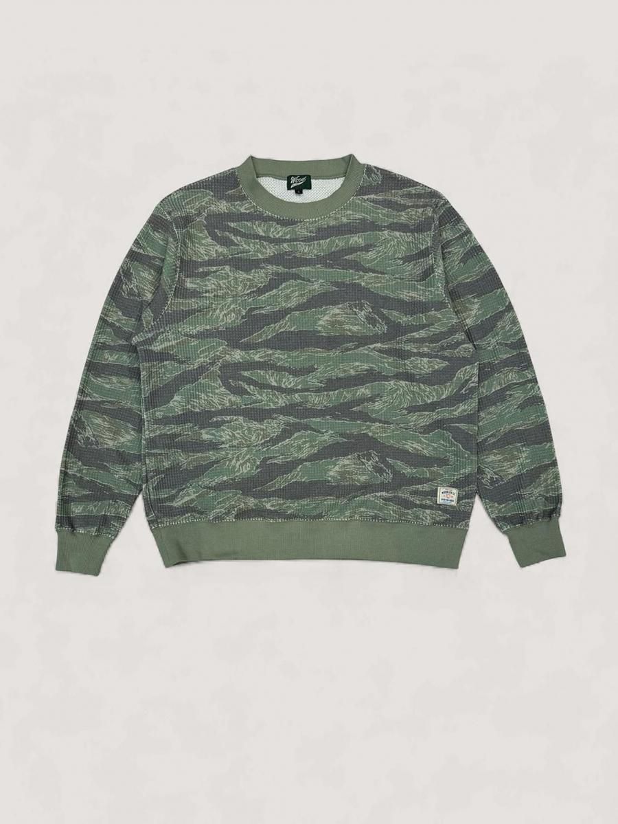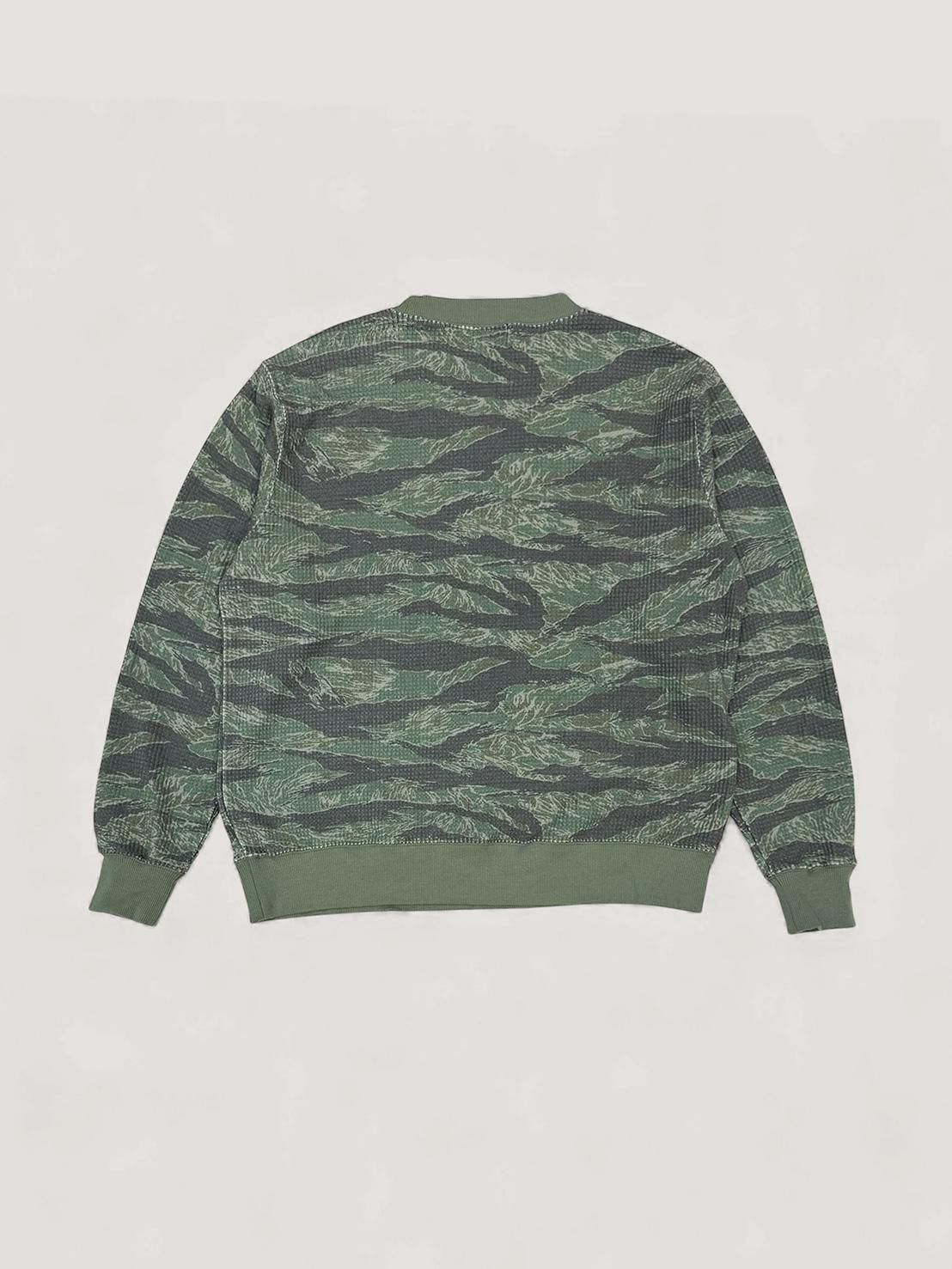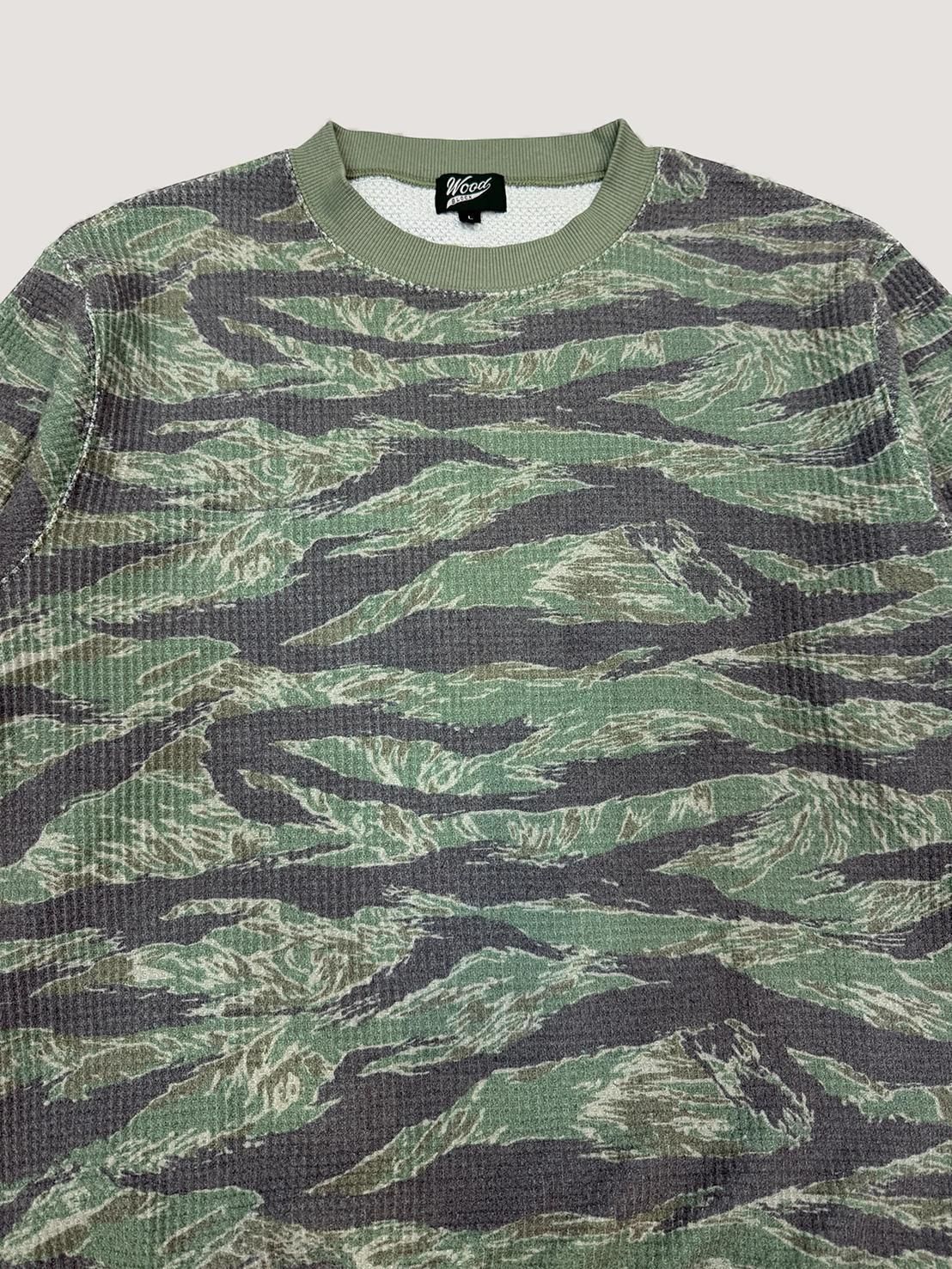 先日リリースのタートルネック同様のサーマル生地にWOODBLOCKオリジナルCAMO柄をプリントし、CREW NECK仕様に仕上げました。